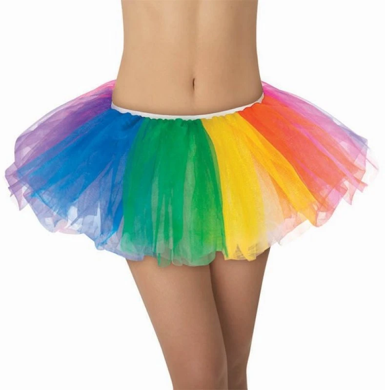 Accessorize your look with our Rainbow Tutu! This rainbow ballerina tutu features colorful tulle fabric and an elastic waistline that stretches for a comfortable fit. Wear it with a fun masquerade costume or for a flirty way to cheer on your team or school.