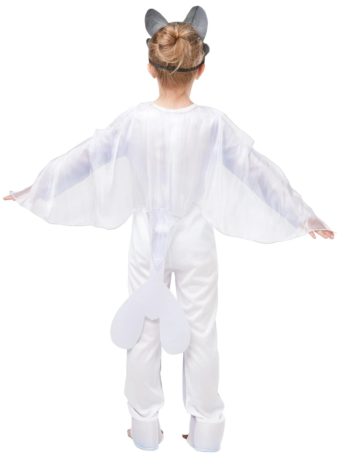 - Wide span, sheer white cape wings made of shiny jersey material with three detachable velcro points to adhere to the arms of the jumpsuit