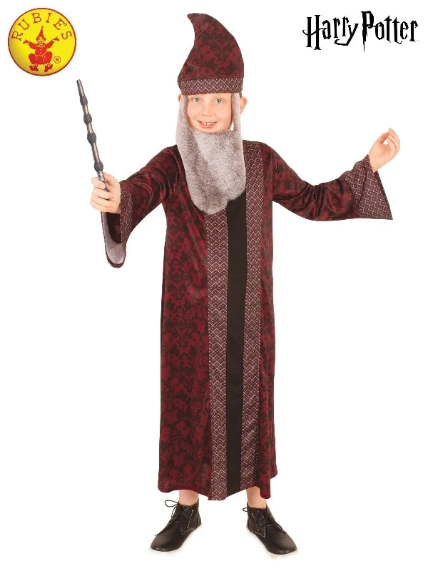 - Trademark Dumbledore hat with mishapen tip in matching colours and attached plush grey beard