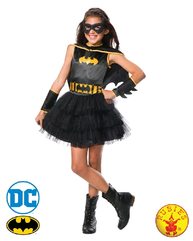 - Dress with digitally printed satin bodice showing bat emblem on chest and belt details at waist, plus ruffle tutu skirt with nylon underlay and three layers of glitter tulle ruffles