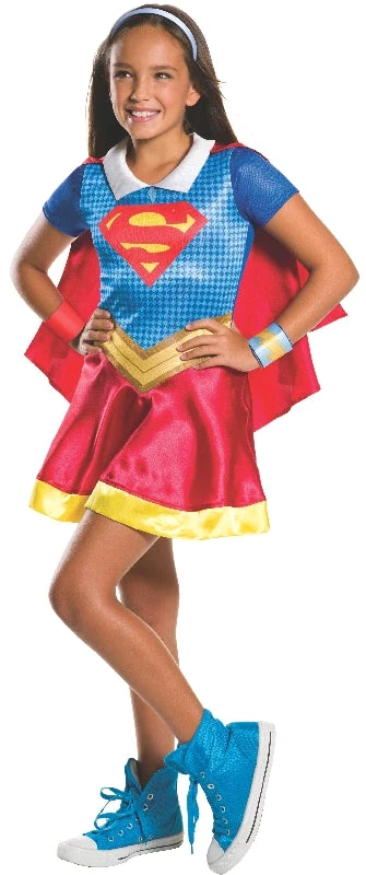 - Dress with digitally printed bodice including pattern, belt and Supergirl logo, Peter Pan collar and short sleeves, plus satin skirt with sewn in colour panel at hem