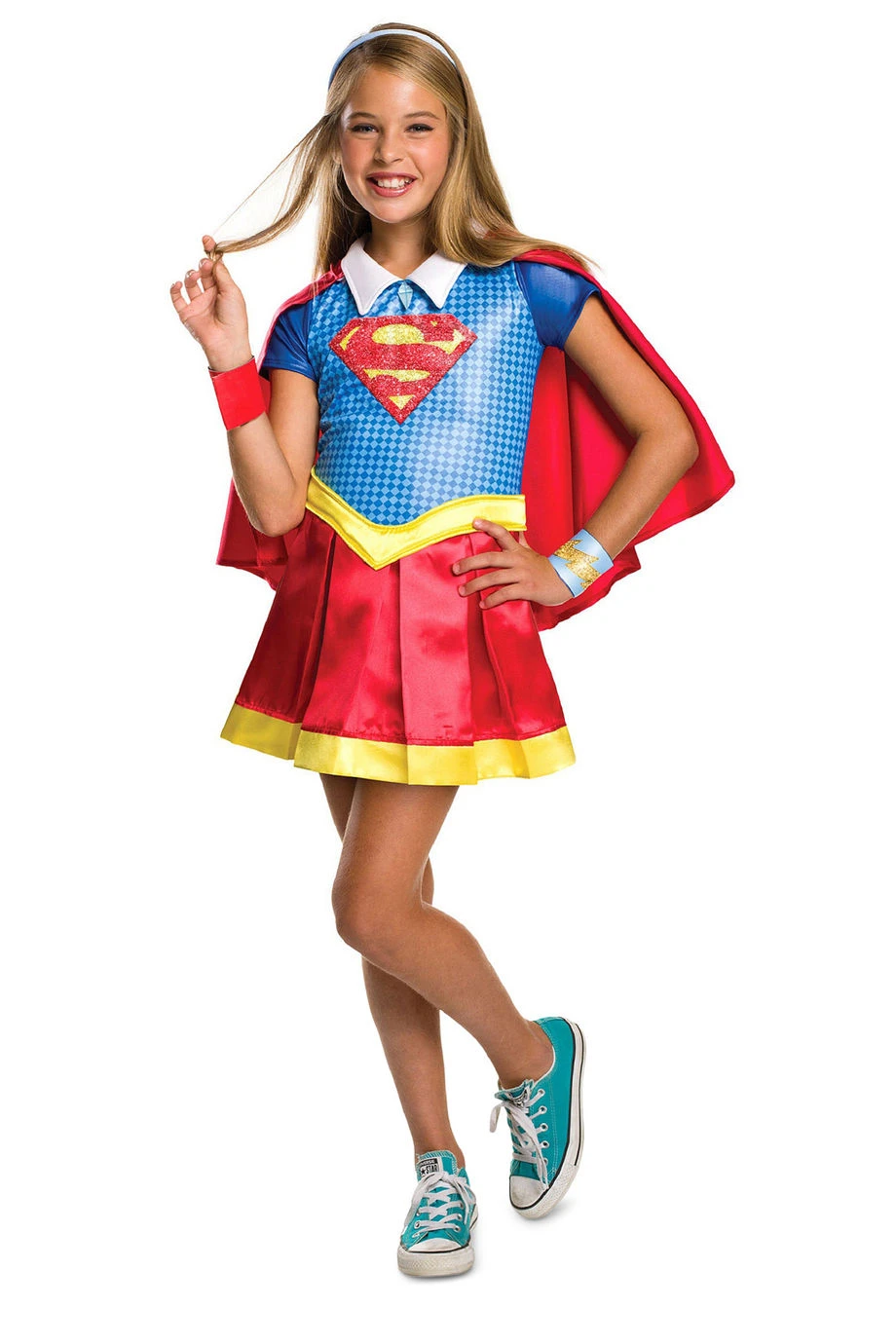 - Top digitally printed pattern, short sleeves, large glitter Supergirl logo on chest, white Peter Pan collar and attached diamond look pendant