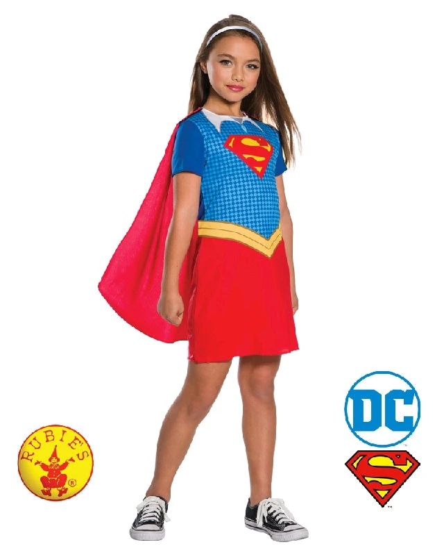 - Dress with digitally printed bodice including pattern, Supergirl emblem, belt and collar plus short sleeves