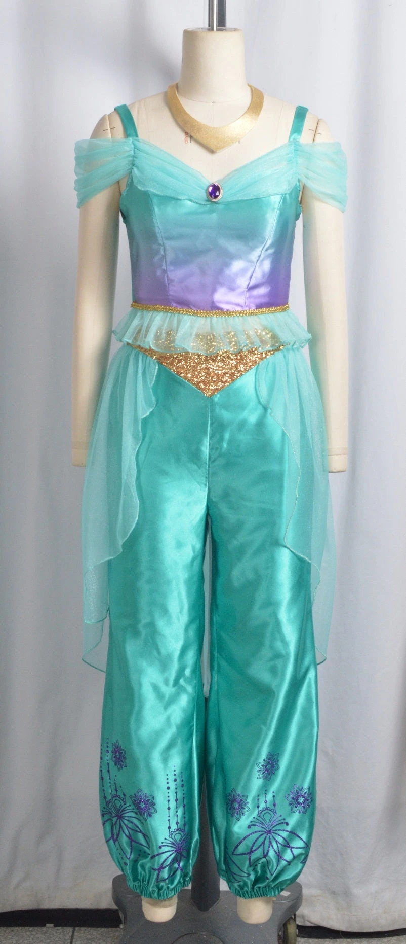 - Top with ombre satin, gold trim and tulle fringe at the waist. Satin straps and tulle gathered collar with jewel pendant