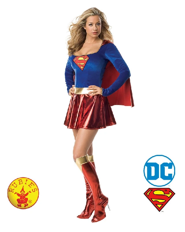 - Dress with scoop neckline with metallic trim, Supergirl emblem printed on chest and full length sleeves with metallic trim plus attached cape in metallic fabric