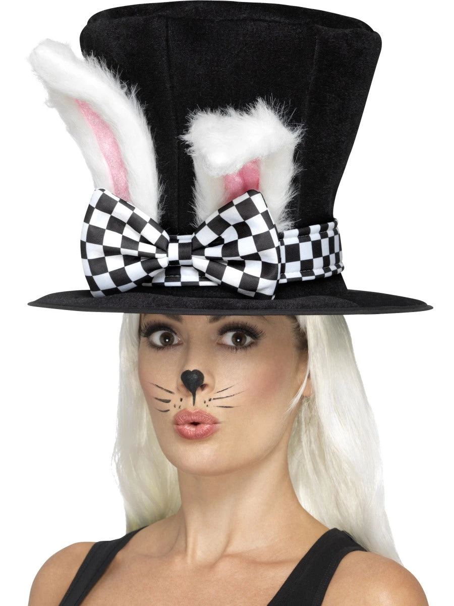 Tea Party March Hare Top Hat, Black & White, with Attached Rabbit Ears